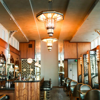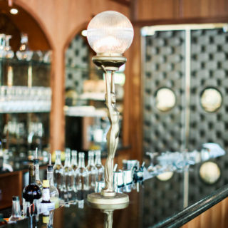 Soft light sparkles everywhere within Paradiso — filtering in through its period specific high reed glass windows, warmly glowing from glass rod sconces (recovered from a 1920s casino on the French Riviera), drifting down from its twin chandeliers, (the pair loving restored to their original art deco theater luster), and reaching upward from three, stunning, bar mounted statue lamps; originally designed as high-styled chair-side ashtrays, and no doubt having graced many a fashionable smoking room. The capacious leather and bent wood dining room chairs are original, once having found purpose in a Parisian law office, they are now destined to be part of the storied history of the Grand Theatre.
